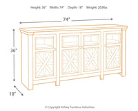 Whether your style is farmhouse fresh, shabby chic or country cottage, you’ll find this medium TV stand perfectly in tune. Its two-tone finish pairs a trendy textured antique white with a weathered gray for that much more quaint character. Charming elements include crossbuck adorned cabinet doors with glass inlays for peek-through flair. Ample adjustable shelving and cutouts for wire management nicely accommodate your media needs.